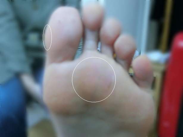 足を見ると写真の白く囲んだ辺りに硬い硬いタコのあった後がありここは表面を削っている