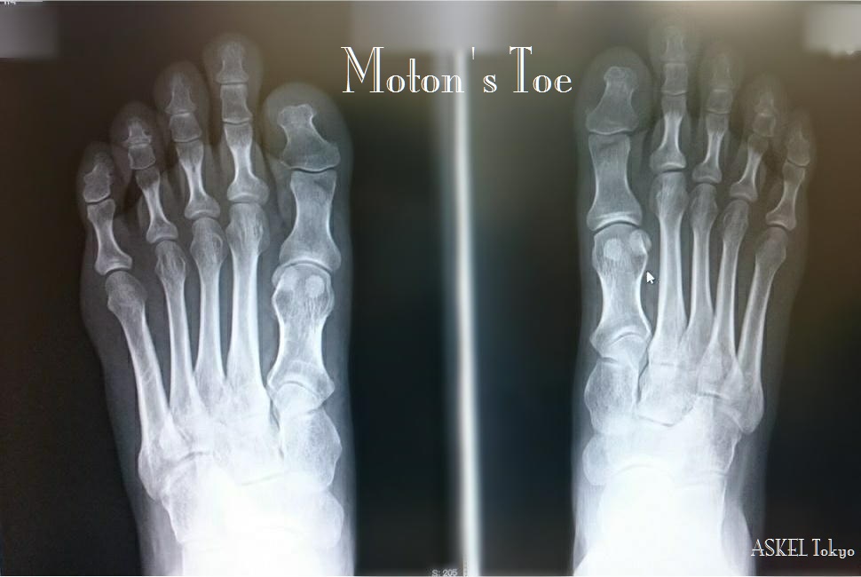 先日、踵周辺と土踏まずの辺りが痛くて診てもらった患者に、整形外科の医師がこの説明をし、その原因と言われるモートン足の動きを指摘し、病気ではないので治療はないが足をよく知ってバ