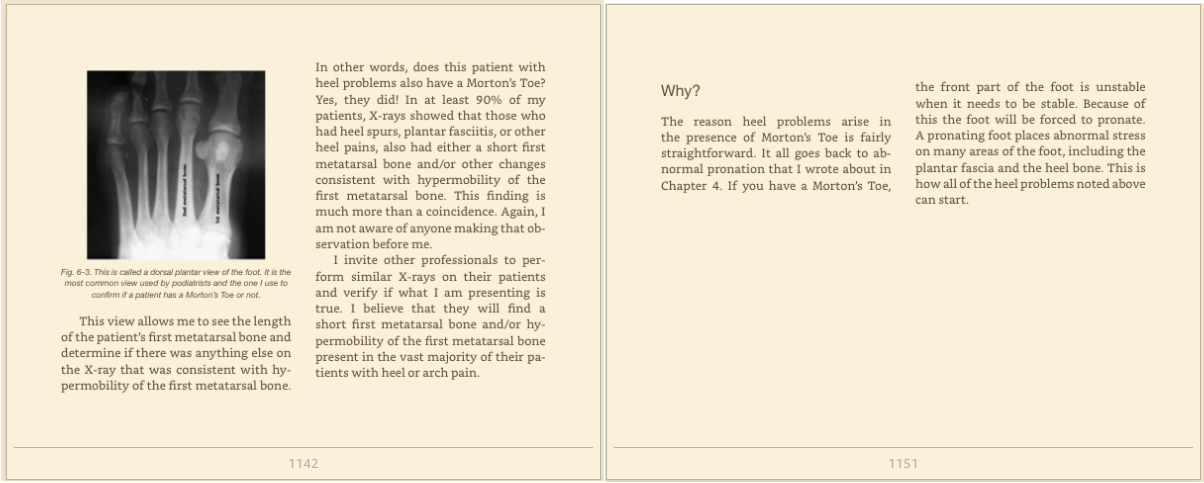 「痛みは足から始まる」の著者であるアメリカの外科医の90%の患者の踵の痛み、踵骨棘、足底腱膜炎の痛みの理由は、第一中足骨が短い足の骨格の方であることが解ったと著書の中に書かれている
