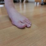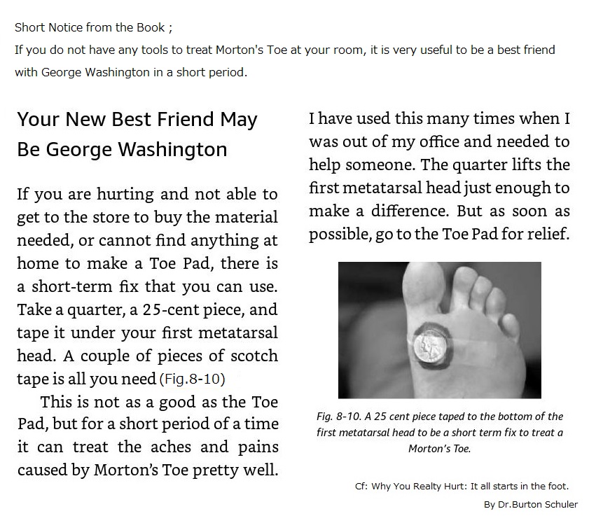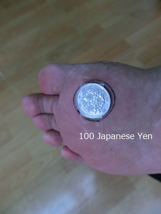 内容は、Morton's toe と呼ばれる方の応急的な改善で、毎日数時間コインを第一中足骨頭のあたりに貼り使うことでゆがみを改善できる