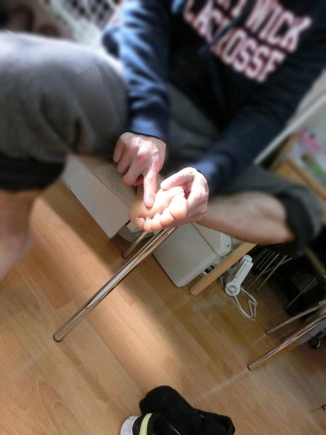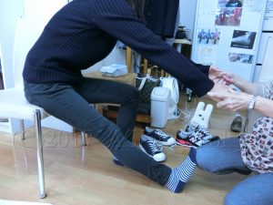 足の状態を診ると足首にバランスよく体重が乗らないで少し左内側に体重を滑らせるとに体重が乗るようでそのためにつま先にかかる体重が横アーチを外側に向けて押しつぶすように動いている