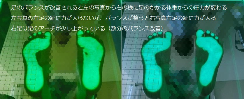 しかし、足のバランスを整えるだけで足の趾の動きが変わり調整前よりしっかり趾先に力が入っているのが分かるしかも、右足のアーチが上がっている