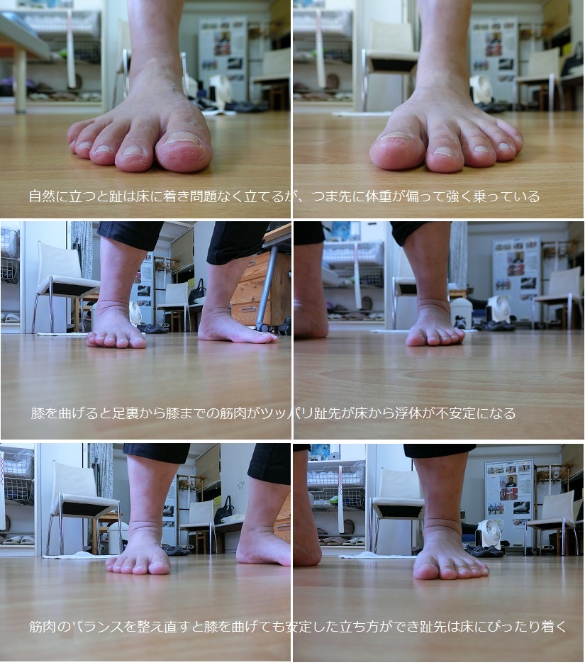 普通に立っているときには足の趾は浮いていないのだが、膝を曲げると浮く