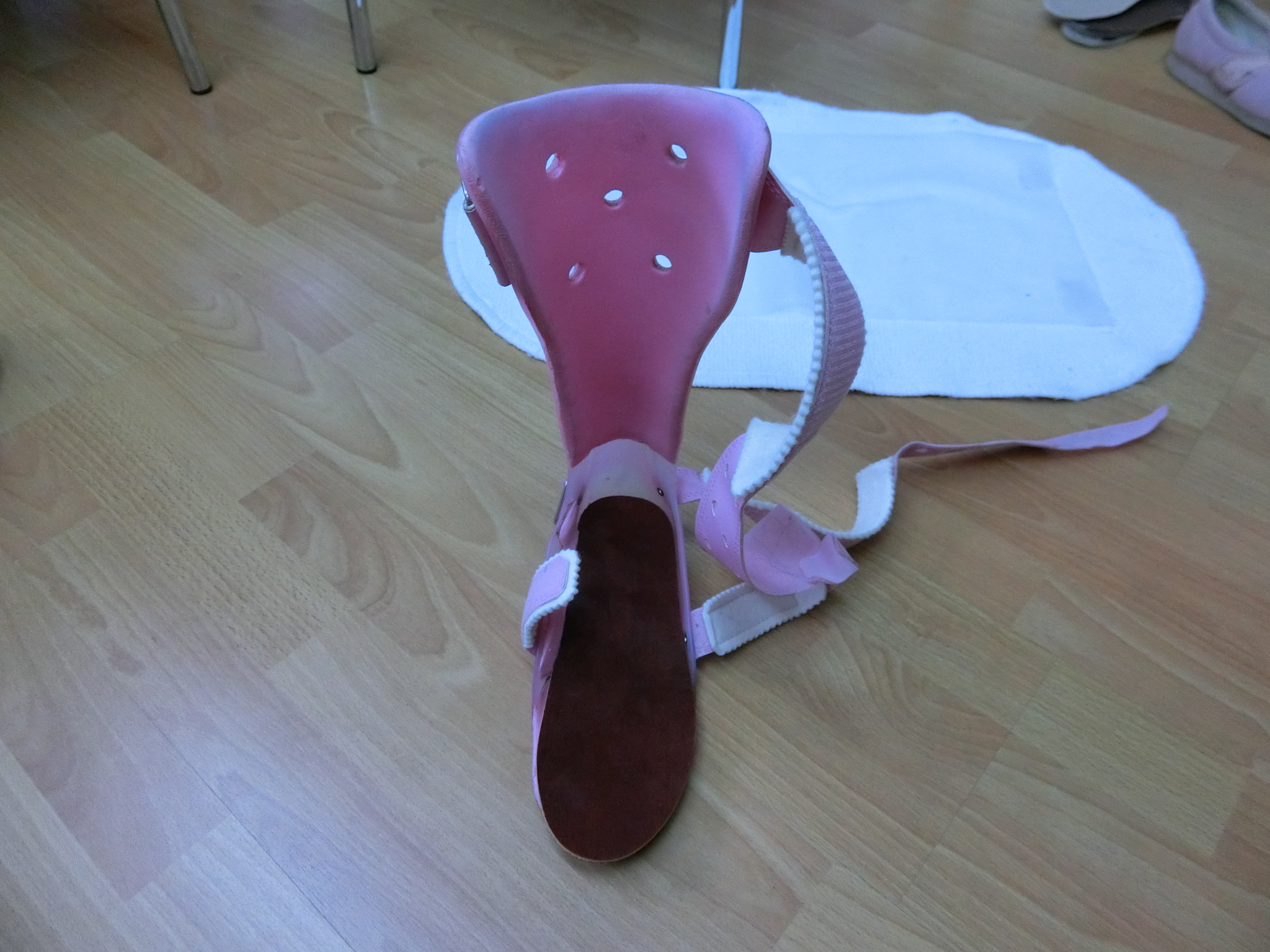 左足は回内しやすく足の内側が補装具に当たりタコが出来たり痛みが出るために補装具屋さんが補装具にピンクの厚手のパッドを付けてくれた(左の写真:クリックすると大きくなります)