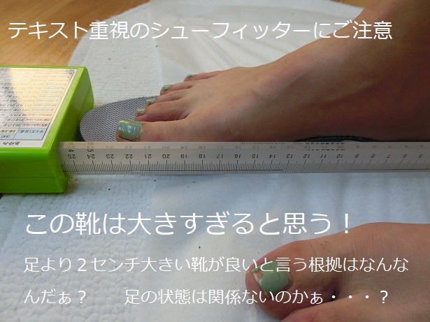 一般には、5ミリから1.5センチが良いともいわれているが、写真のように2センチ(2.5センチ弱)大きい靴は間違いだろう