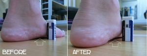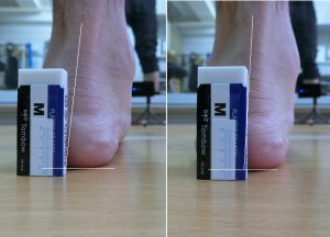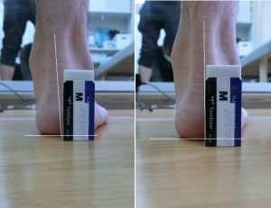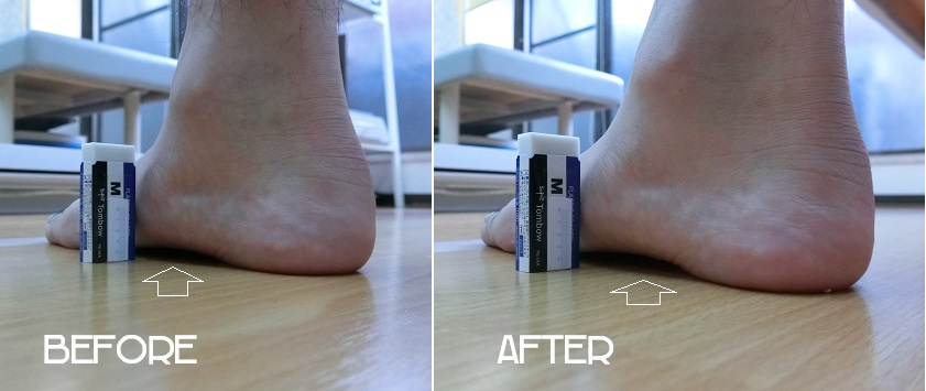 踵の傾きが変わったことは上写真で簡単に理解できると思うが、外反の動きの改善は足裏から膝にかけて踵を安定させる筋肉を整えると踵の外反状態が変わります