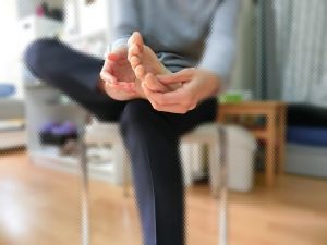 写真左は、素足のまま床に立って膝を少し曲げるようにしたら母趾の先(母趾のつま先外側の下)に体のぐらつきを止めるように力がかかっている