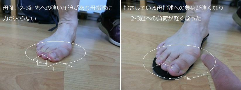 写真右のように手の指のさすあたりの裏側(母趾球)に力が乗り、それによって母趾の外側先にかかる力が軽くなった