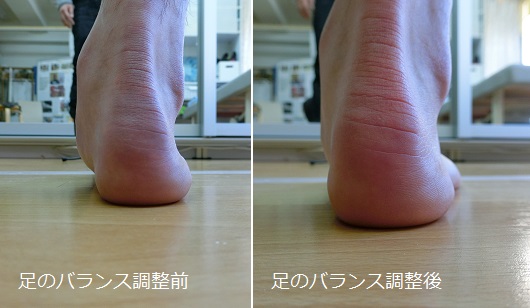 ご本人にも踵の違いを写真を見ていただきバランス調整の結果を確認していただいた(ご協力ありがとうございました)