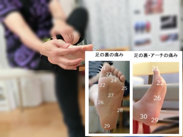 足の大きさに合った靴にオーダーメイドのインソールを入れて使っているがなぜか足の趾(母趾)の内側の横と裏の間あたり(足の痛いところ地図の21.22.23周辺)が痛くて歩くのがつらい