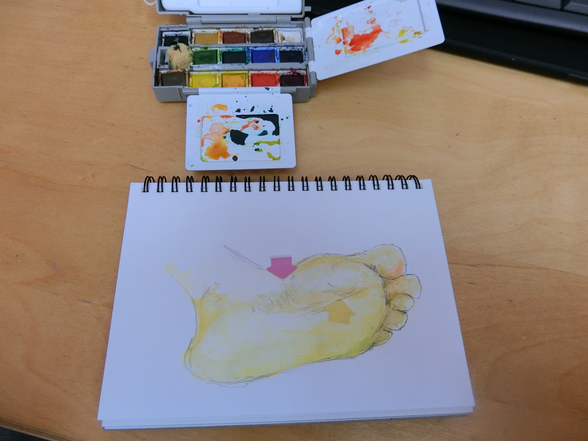疲れて座ってストレッチしてみると…つま先を伸ばして内側にひねると足裏の外側と真ん中(黄色い矢印辺り)と3,4番の趾の裏側に緊張した痛みがでる