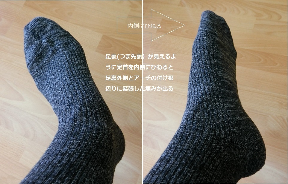 痛い箇所は「足の痛いところ地図」の26、27、28の辺りに歩く時に痛みがあり、つま先を伸ばして内側にひねると28、27、4,5の裏側に緊張の痛みが出る