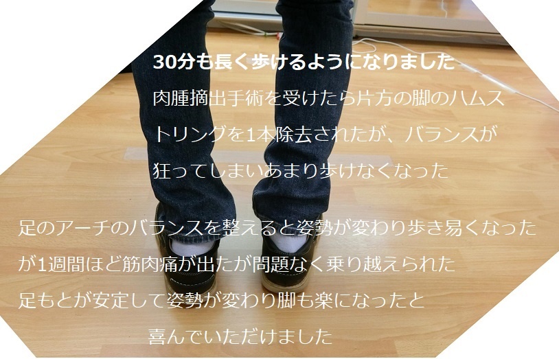 このバランス維持しながら過ごして貰ったらふくらはぎ、太もも腰、背中とカラダ中に痛が出て1週間くらい場所を変えて筋肉痛がでたが今はもうずいぶん楽になりましたと報告を頂いた