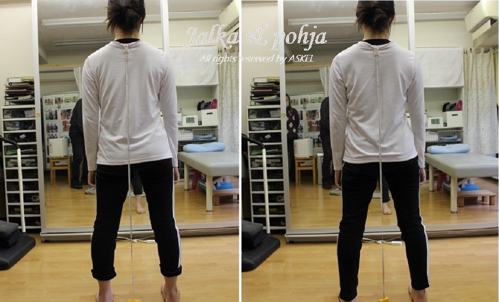 左側は来店時の姿勢で右側は左右の足のバランスを整えた(3分程度の足の調整)後の姿勢