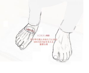 リフスラン関節は足の甲の真ん中辺りに可動性の低い関節で合計5本の足趾を支える重要な骨