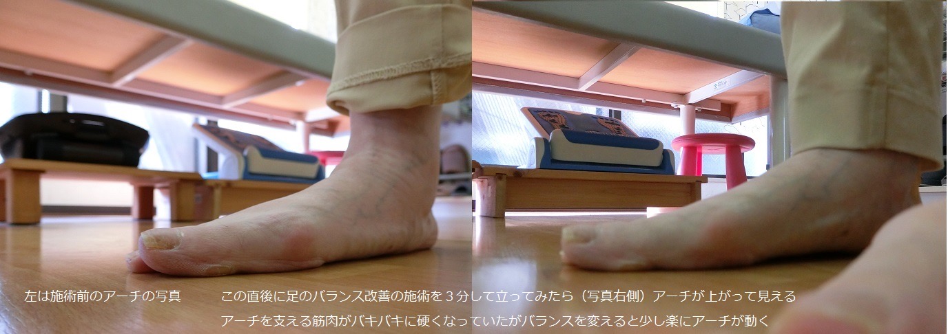 写真では分かりにくいが施術の後はアーチを持ち上げる筋肉も動い始め改善んされてきているのが見える