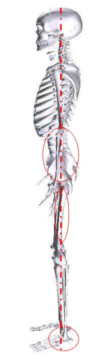 一般に正しい姿勢とは、左のように、「耳」「肩」「膝の関節の後方」「足の踝」辺りに、真っ直ぐに降りてくる直線を描く姿勢です。