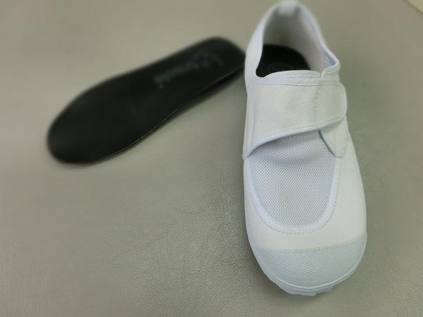 足に機能を少し調整して、外反扁平足改善のインソールを作り、校内履きにフィットさせた。
