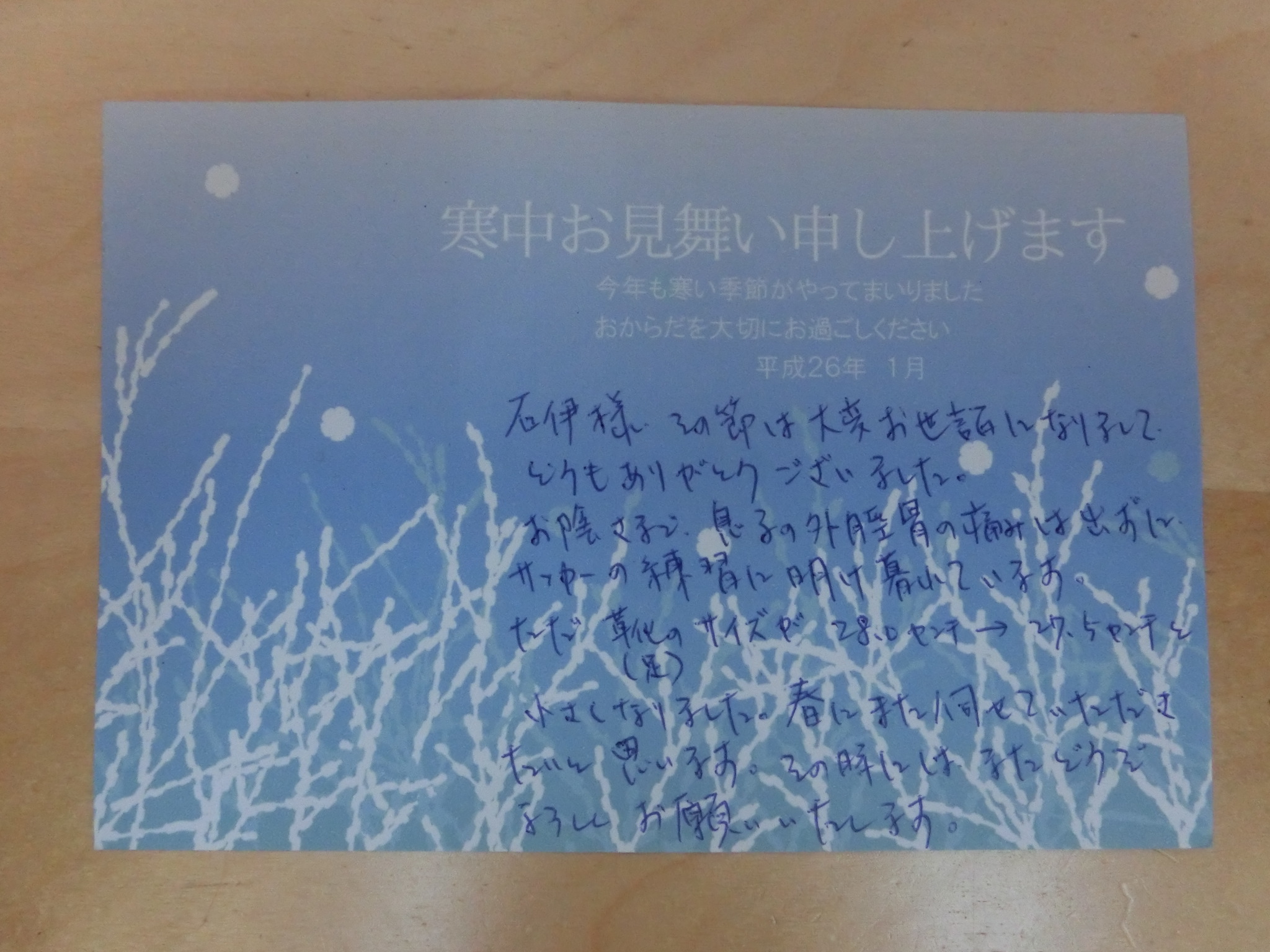 今年(2014年1月10日)に「外脛骨の痛みがでない状態になり、サッカーの練習に励んでいる」との経過の葉書を頂きました。